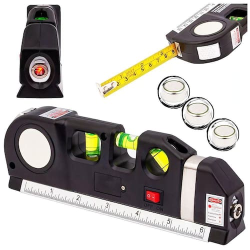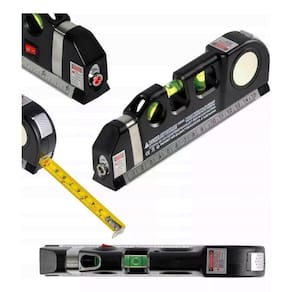 O laser alcança até 8m de distância. Funciona com 3 baterias AG13. O nível possui 3 linhas e a régua tem medidas em centímetros e polegadas. Projeta o feixe na horizontal, vertical ou em cruz (para alterar a projeção, é necessário mover o laser para cima ou para baixo).