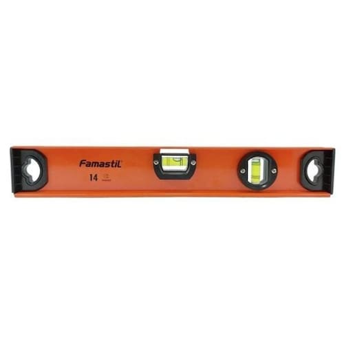O Nível de Alumínio Famastil tem bolhas de plástico, que não quebram. Essa ferramenta garante que o piso e outras superfícies estejam alinhados horizontalmente. Tem ponteira plástica nas extremidades, e as bolhas são calibradas.