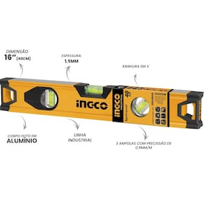 Resultado: Este novo nível profissional Ingco chegou para facilitar a sua vida! Com atributos que vão facilitar o dia a dia do profissional da construção civil. Como feito em alumínio de alta resistência! Possui 3 ampolas de alta precisão e com acabamento em sua lateral emborrachado. Resistente a atritos e impactos.