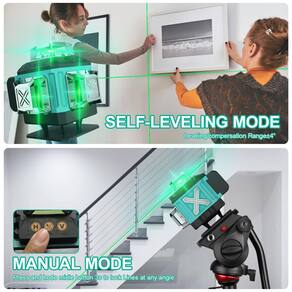 - ?Modo autonivelante e manual??Modo de nivelamento automático a laser 360: Desbloqueie o pêndulo, o nível de lazer se autonivelará dentro de 4° (caso contrário, o laser continuará piscando). ? Modo manual: mantenha pressionado o botão "EXTERIOR" (botão do meio) por 3 segundos para ativar o modo manual, você pode projetar linhas de laser em qualquer ângulo. Atenda às suas necessidades de alinhamento de diferentes ângulos.