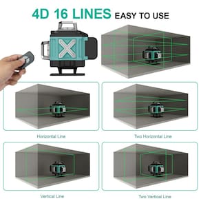 Nível de laser autonivelante de 16 linhas, 4D 4 x 360° com cruz verde para construção com 2 baterias recarregáveis, dois controles remotos verticais de 360° e dois controles remotos horizontais de 360°