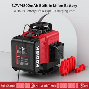 - ?Grande capacidade de bateria e exibição do nível da bateria?Uma bateria de grande capacidade de 4800 mAh, interface tipo C, visor do nível da bateria do corpo, este nível de laser pode manter mais de 8 horas de trabalho contínuo com todas as 16 linhas totalmente abertas. Fácil de carregar.