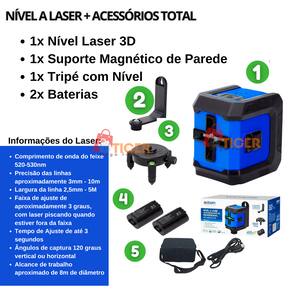 1x Nível Laser 3D 1x Suporte Magnético de Parede 1x Tripé com Nível 2x Baterias