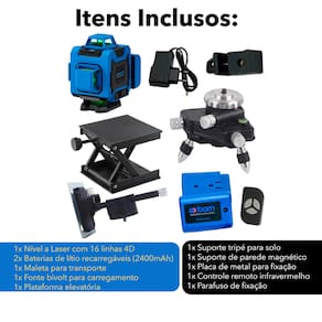 Modelo: Nível a Laser 16 Linhas 4D Alcance Efetivo: Até 30 metros Fonte de Luz: Sharp 515 nm (laser verde) Bateria: 2x baterias de lítio recarregáveis (2400mAh) Controle: Infravermelho Precisão: ±1mm a cada 7 metros Proteção: IP54 (resistente a respingos de água) Alimentação: Bivolt com entrada USB Tipo-C (5V) Potência de Saída: menor ou igual a 5MW Material: Alumínio e Macromolécula ABS Acessórios de Suporte: Plataforma elevatória, suporte magnético articulado e tripé para solo