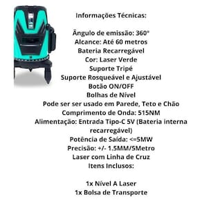 Nível laser profissional nivelamento recarregável 2 linhas :: dk utilidades :: Apresenta: Nível laser profissional nivelamento recarregável 2 linhas Vantagens:-nível laser com laser verde, que é 4x mais visível que o vermelho.-possui função de auto nivelamento nível, prumo e esquadro .-possui bateria recarregável.-informa o ponto de prumada.-informa quando o laser está desnivelado, piscando o laser.-pode ser utilizado com o pêndulo travado e pêndulo solto.-acompanha maleta rígida para guardar o equipamento e não pegar poeira. Parâmetros técnicos:- fonte de luz: class ii / class iiia - alta potência- precisão horizontal e vertical: 1mm/ 7m- precisão de ponta a ponta: 1mm/ 1m- espessura da linha: 2mm/ 5m- ângulo de projeção: 110- área de trabalho: interior 10m, ar livre 30-50cm- fonte de energia: dc 4.5 aa 1.5 vx3 - tamanho: 118mm x 195mm- peso: cerca de 2.3kg Itens inclusos:- 1 manual;- 1 nível laser profissional cor verde;- 1 maleta rígida;- 1 cabo usb