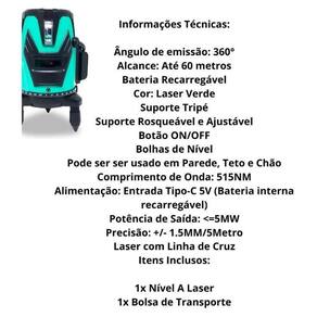 Itens inclusos: - 1 manual; - 1 nível laser profissional cor verde; - 1 maleta rígida; - 1 cabo usb Marca: Não Informado