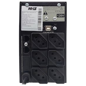 Saída Tensão nom. saída: 120V (220V configurável através de troca de jumper interno por soldagem) Fx. tensão saída rede: -9%/+13% Fx. tensão saída inversor: 120V +-3% (220V+-3%) Frequência de saída: 50Hz/60Hz +-0,1% inversor adaptável de acordo com a frequência de entrada da rede elétrica Forma-de-onda: Senoidal Número de tomadas: 6 Estágios de regulação: 2