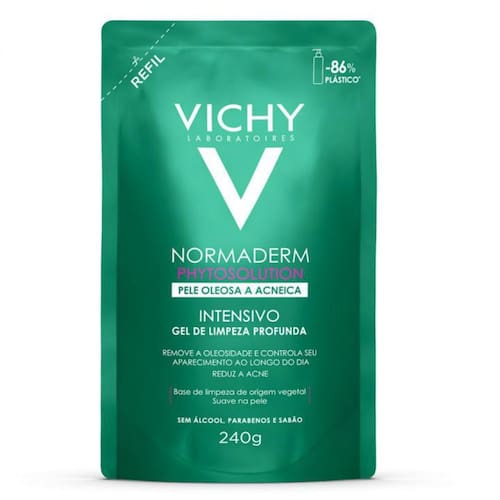 Vichy Normaderm Phytosolution Intensivo Refil Gel de limpeza para peles oleosas e acneicas. Vichy Normaderm Phytosolution Intensivo remove as impurezas profundamente, sem agredir a pele.