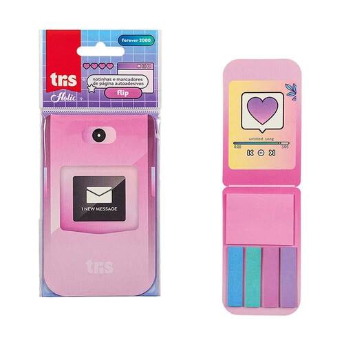 A coleção forever 2000 dá um toque moderno aos elementos nostálgicos que estão em alta. Cores fortes, molduras de sistemas operacionais antigos e efeito glitch são algumas das características dessa linha que veio para resgatar os anos 2000 com muita diversão e estilo. O kit de notas autoadesivas flip é inspirado no celular mais icônico da época e possui 1 bloco de notinhas e 4 blocos de marcadores de páginas.