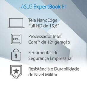 Repleto de recursos especialmente desenvolvidos para obter o melhor desempenho corporativo, o ASUS ExpertBook B1 é a escolha ideal para pequenas ou grandes empresas. Ele conta com um design compacto, tela de 15,6 polegadas com mais brilho e nitidez, segurança de nível empresarial, ampla conectividade e resistência e durabilidade no padrão militar, o que garante um desempenho impressionante e confiável para a sua rotina de trabalho. Esse é o ASUS ExpertBook B1, perfeito para o seu negócio.