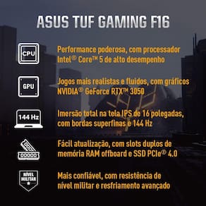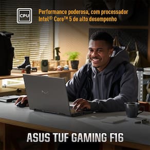O poderoso notebook gamer ASUS TUF Gaming F16 une performance de alto nível com design robusto e estiloso. Feito para gamers exigentes e profissionais que buscam tecnologia de ponta, este computador transforma a experiência de jogo e trabalho, com processador Intel Core 5 210H de alto desempenho e gráficos dedicados NVIDIA GeForce RTX 3050. Há ainda tela imersiva com bordas finas, fácil atualização de memória RAM e SSD, e resistência de nível militar para aguentar qualquer tranco.