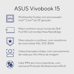 Com visual moderno, componentes atualizados e conforto superior, o ASUS Vivobook 15 é a escolha ideal para quem precisa de um notebook confiável para trabalhar, estudar e realizar tarefas do dia a dia. Este computador não só combina alto desempenho, experiência audiovisual imersiva e construção robusta, como também protege sua saúde com tecnologias exclusivas da ASUS.