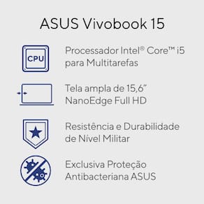 Torne suas atividades cotidianas mais extraordinárias com o ASUS Vivobook 15, uma ferramenta indispensável para realizar tarefas com facilidade em qualquer lugar. Sua praticidade é evidente com a dobradiça plana de 180 e a tampa de proteção física para a webcam. Além disso, a Proteção Antibacteriana ASUS preserva sua saúde ao proteger as áreas do notebook mais frequentemente tocadas pelo usuário, contra bactérias prejudiciais, enquanto a resistência e durabilidade de nível militar garantem a qualidade física do produto. Faça de cada dia uma experiência mais agradável com o ASUS Vivobook 15 e viva o melhor!
