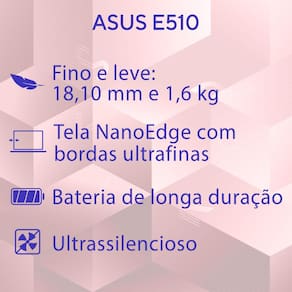 Na vida, o ideal é encontrar o equilíbrio certo e o novo notebook ASUS E510 oferece exatamente isso. Leve e compacto, ele apresenta um novo visual elegante que se adapta perfeitamente ao seu estilo de vida dinâmico. Com recursos inovadores, o ASUS E510 oferece tudo que você precisa para trabalhar ou se divertir.