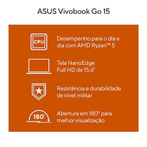 É leve. É compacto. É o ASUS Vivobook Go 15. Projetado para torná-lo produtivo e mantê-lo entretido onde quer que você vá! Com processador AMD Ryzen 5 7520U de excelente desempenho, 8 GB de memória RAM LPDDR51 e até 512 GB de SSD2 , ele é perfeito para seu dia a dia. Ainda conta com uma dobradiça plana de 180, tampa física protetora na webcam e muitos recursos de design bem pensados incluindo uma tela de 15 polegadas antirreflexo Full HD tudo para que você vá além!