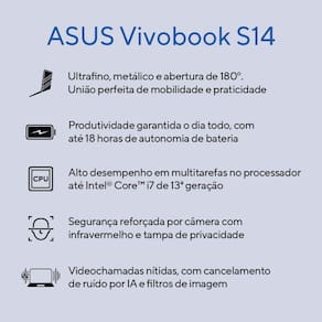 O ASUS Vivobook S14une estilo, potência e segurança qualidades essenciais para quem busca o melhor notebook para trabalho, estudo ou lazer. Odesign metálico ultrafino com abertura de 180garante mobilidade e praticidade, enquanto abateria de longa duraçãopermite um dia inteiro de produtividade. Equipado comprocessador até Intel Core i7 13620H, que alcança alto desempenho em multitarefas, o dispositivo ainda temcâmera com infravermelho e tampa de privacidadepara reforçar a segurança. Por fim,tecnologias de IA tornam videochamadas mais nítidas via cancelamento de ruído e filtros de imagem.