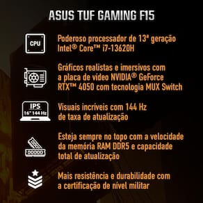 Conheça a nova linha de notebooks gamer TUF Gaming, da ASUS, feita para aqueles que buscam performance em jogos competitivos e querem vencer todos os desafios do dia a dia. Preparado para qualquer campo de batalha, o novo ASUS TUF Gaming F15 supera os limites, seja jogando, fazendo livestreams ou em qualquer outra atividade.