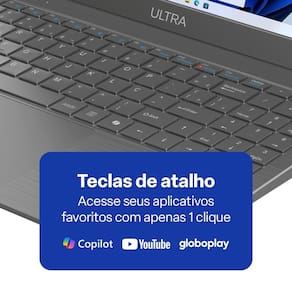 Marca: Multi Modelo: UB365 Tela: 15.6 FHD Cor: Cinza Sistema Operacional: Windows 11 Home Processador: Intel Pentium Gold 6500Y -4 MB de cache, ate 3,40 GHz- Armazenamento interno: 128 GB Flash -eMMC- -expansivel via slot M.2 2280 com suporte a NVMe 3.0 e SATA 3.0- Memoria RAM: 4GB DDR3L Camera: 2MP com cover fisico de privacidade + 2 microfones direcionais Conexao Wireless: Wi-Fi 802.11ac + Bluetooth 5.0 Portas: 2x USB 3.0; 1x HDMI; 1x conector de audio tipo Combo e 1x leitor de cartao microSD Audio: Amplificado de Alta Definicao -HD- Bateria: 7.6V 4000mAh Dimensoes: 357,4 x 233,8 x 21,3 mm Peso: 1,72 kg Certificado Anatel: 15777-22-03111 Conteudo da embalagem: Notebook Ultra, fonte de alimentacao e guia rapido Garantia: 1 ano e acessorios 3 meses
