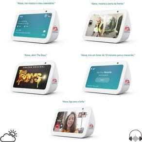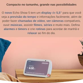 Veja mais com a câmera integrada - use a câmera integrada para ver seus familiares, pets e muito mais. Faça uma chamada por drop in para sua casa quando você sair ou veja a porta da frente pelo seu echo show 5 usando câmeras compatíveis.
