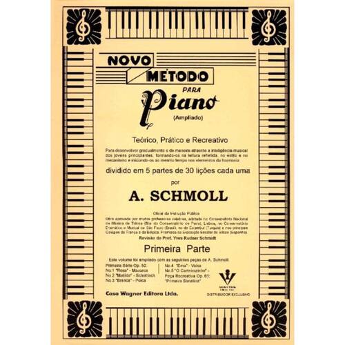 Tradicional método para piano dividido em cinco partes, tendo como proposta o desenvolvimento gradual e eficiente da inteligência musical de principiantes, formando-os na leitura refletida, no estilo e nos elementos da harmonia. Esta primeira parte comporta, além das 30 lições do método, as seguintes peças: Rosa (mazurca), Matilde (schottisch), Branca (polca), Ema (valsa), O carteirozinho e Primeira sonatina. Marca: IRMAOS VITALE EDITORES