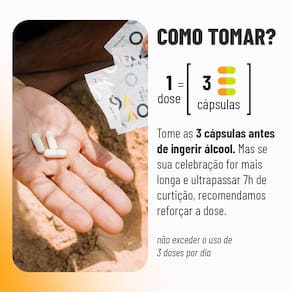 Bem simples e fácil! Consuma 1 dose (3 cápsulas) do Novvo Pré-Drink com o primeiro gole de celebração, e caso a celebração dure mais de 7 horas, reforce com mais uma dose.