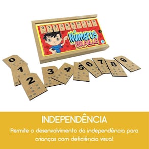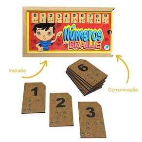 Numerais 0 A 9 Jogo Inclusivo em Braille Baixa Visão Madeira O sistema de leitura tátil ou braille é completo, seguro e eficiente para o aprendizado de pessoas com deficiência visual. Este é um material que contem os números de 0 a 9.