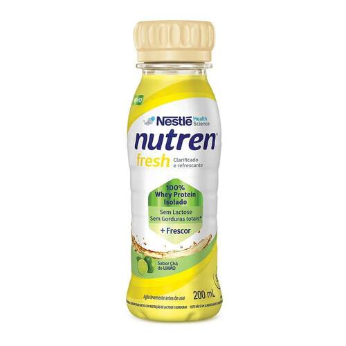 Nutren Fresh Chá de Limão. Alimento pronto para o consumo, clarificado e refrescante, sabor chá de limão. Sem lactose e sem gorduras totais*, com 100% whey protein isolado do total de proteínas.