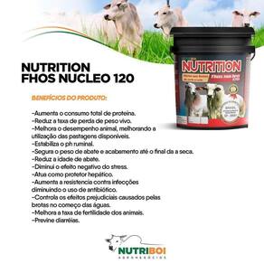 Abaixa á o custo do sal mineral em sua propriedade com o Nutrition Fhos Núcleo 120; o lucro e certo; BENEFÍCIOS DO PRODUTO: -Aumenta o consumo total de proteína; -Reduz a taxa de perda de peso vivo; -Melhora o desempenho animal, melhorando a utilização das pastagens disponíveis; -Estabiliza o ph ruminal; -Segura o peso de abate e acabamento até o final da a seca; -Reduz a idade de abate; -Diminui o efeito negativo do stress; -Atua como protetor hepático; -Aumenta a resistencia contra infecções diminuindo o uso de antibiótico; -Controla os efeitos prejudiciais causados pelas brotas no começo das águas; -Melhora a taxa de fertilidade dos animais; -Previne diarréias; modo de usar: 0,500 gr Nutrition Fhos 120 por saca de sal branco (pronto seu sal mineral já esta pronto para uso;)