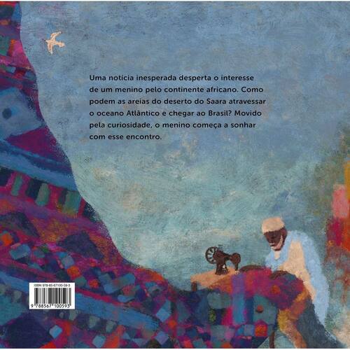 Uma narrativa que atravessa oceanos, mapas e sonhos, revelando o poder das histórias que conectam mundos. Uma notícia inesperada trazida pelo vento desperta a curiosidade de um menino: uma nuvem de areia do deserto do Saara está a caminho do Brasil. Intrigado com o fenômeno, ele se pergunta como algo tão distante pode cruzar o Atlântico e chegar até sua praia. Movido pela imaginação e pela vontade de entender esse mistério, o menino embarca em uma jornada de descobertas. Mapas, livros e pesquisas se tornam portais para explorar o continente africano, suas paisagens, idiomas e histórias. Cada nova informação revela conexões inesperadas e alimenta sua curiosidade sobre um lugar repleto de mistérios e culturas. Enquanto espera a chegada da nuvem, realidade e sonho se entrelaçam. O vento transforma-se em uma ponte entre mundos, levando o menino a um encontro poético com o desconhecido e a magia das descobertas. Indicado para leitores a partir de 4 anos.