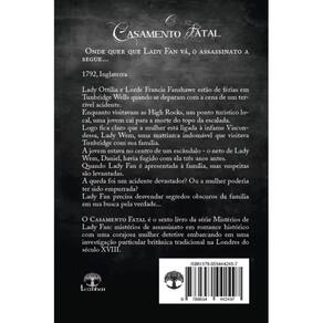 Onde quer que Lady Fan vá, o assassinato a segue... 1792, Inglaterra Lady Ottilia e Lorde Francis Fanshawe estão de férias em Tunbridge Wells quando se deparam com a cena de um terrível acidente. Enquanto visitavam as High Rocks, um ponto turístico local, uma jovem cai para a morte do topo da escalada. Logo fica claro que a mulher está ligada à infame Viscondessa, Lady Wem, uma matriarca indomável que visitava Tunbridge com sua família. A jovem estava no centro de um escândalo - o neto de Lady Wem, Daniel, havia fugido com ela três anos antes. Quando Lady Fan é apresentada à família, suas suspeitas são levantadas. A queda foi um acidente devastador? Ou a mulher poderia ter sido empurrada? Lady Fan precisa desvendar segredos obscuros da família em sua busca pela verdade... O casamento fatal é o sexto livro da série Mistérios de Lady Fan: mistérios de assassinato em romance histórico com uma corajosa mulher detetive embarcando em uma investigação particular britânica tradicional na Londres do século XVIII. Marca: Leabhar Books Editora