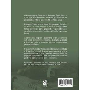 O Chamado dos Generais do Reino de Pablo Marçal é um livro dividido em seis capítulos que exploram os princípios de vida de generais do Reino de Deus. Utilizando como base a figura dos generais do Reino de Deus, o autor convida o leitor a refletir sobre temas essenciais como propósito, responsabilidade, relacionamentos, autenticidade espiritual e esperança futura. A obra busca inspirar e desafiar o leitor a viver uma vida mais significativa, utilizando exemplos práticos e histórias reais de pessoas que são consideradas generais do Reino. O autor também aborda a questão da responsabilidade e do domínio pessoal, defendendo uma postura ativa e consciente diante da vida. Ele enfatiza a importância de governar a própria vida e as áreas que foram confiadas por Deus com sabedoria e discernimento. Desfrute da leitura de um livro inspirador, que despertará em você seu verdadeiro chamado de vida.