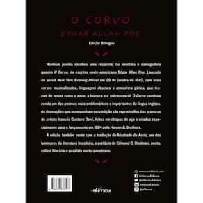 Nenhum poema recebeu uma resposta tão imediata e esmagadora quanto O Corvo, do escritor norte-americano Edgar Allan Poe. Lançado no jornal New York Evening Mirror em 29 de janeiro de 1845, com seus versos musicalizados, linguagem obscura e atmosfera gótica, que tratam de temas como o amor, a loucura e o sobrenatural. O Corvo continua sendo um dos poemas mais emblemáticos e importantes da língua inglesa. As ilustrações que acompanham esta edição são reproduções das gravuras do artista francês Gustave Doré, feitas em chapas de aço e criadas especialmente para o lançamento em 1884 pela Harper & Brothers. A edição também conta com a tradução de Machado de Assis, um dos luminares da literatura brasileira, e prefácio de Edmund C.Stedman, poeta, crítico literário e ensaísta norte-americano. Ean: 9786587638577