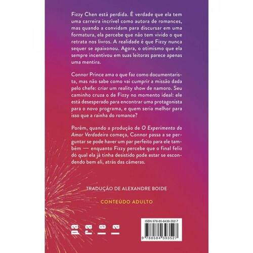 O livro que os fãs de Christina Lauren estavam esperando desde que conheceram Fizzy em A equação perfeita do amor. Fizzy Chen está perdida. É verdade que ela tem uma carreira incrível como autora de romances, mas, quando a convidam para discursar em uma formatura, ela percebe que não tem vivido o que retrata nos livros. A realidade é que Fizzy nunca sequer se apaixonou. Agora, o otimismo que ela sempre incentivou em suas leitoras parece apenas uma mentira. Connor Prince ama o que faz como documentarista, mas não sabe como vai cumprir a missão dada pelo chefe: criar um reality show de namoro. Seu caminho cruza o de Fizzy no momento ideal: ele está desesperado para encontrar uma protagonista para o novo programa, e quem seria melhor para isso que a rainha do romance? Porém, quando a produção de O Experimento do Amor Verdadeiro começa, Connor passa a se perguntar se pode haver um par perfeito para ele também — enquanto Fizzy percebe que o final feliz do qual ela já tinha desistido pode estar se escondendo bem ali, atrás das câmeras. CONTEÚDO ADULTO Ean: 9788584393527