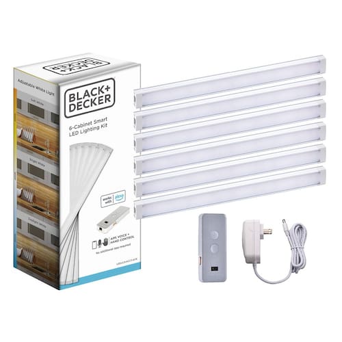 BLACK+DECKER Funciona com Alexa Smart Under Cabinet Lighting Kit, LEDs ajustáveis, (6) barras de 23 cm, branco - Funciona com Alexa: use o comando de voz ou o aplicativo Alexa para controlar energia, escurecimento, modo noturno e luz branca ajustável - Para dicas sobre como montar seu sistema e se conectar à Alexa, consulte o guia do usuário na embalagem e na parte inferior desta página - Digitalize e escolha uma configuração sem frustrações com seu dispositivo Alexa, sem necessidade de aplicativo de terceiros - Sem necessidade de ferramentas: Instale seu kit de iluminação LED inteligente em algumas etapas fáceis - Instalação flexível: Conecte até 6 barras em uma configuração dividida ou contínua - Luz ambiente: a barra de luz ultrafina de 23 cm ilumina zonas de luz amplas e sem cintilação de até 91 cm com luz branca ajustável - Simplifique suas rotinas diárias: crie modos de luz personalizados, emparelhe com outros dispositivos inteligentes, automatize tarefas e muito mais - Ativação sem toque: o sensor de movimento mantém as mãos limpas, basta acenar a mão dentro de 10 cm do sensor de movimento - Custo-benefício: os LEDs PureOptics duram até 50.000 horas e usam 85% menos energia do que as lâmpadas incandescentes - Especificações por barra: 335 lúmens/bar, 3000K | 4000K | 5000K CCT, 84 CRI