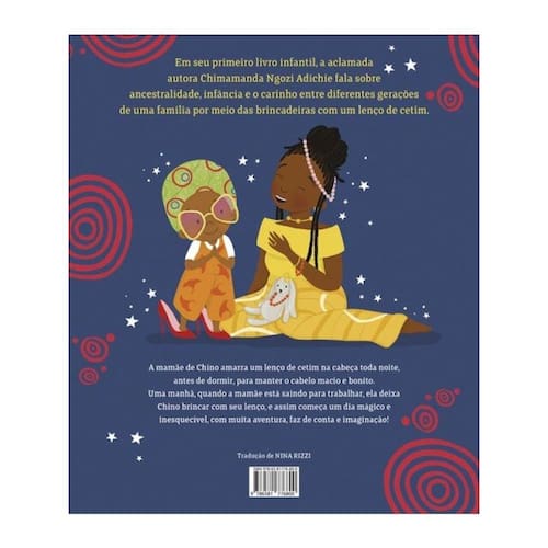 Em seu primeiro livro infantil, Chimamanda Ngozi Adichie escreve sob o nome de Nwa Grace-James e faz uma homenagem poética e carinhosa às alegrias cotidianas da vida em família. A mamãe de Chino amarra um lenço de cetim toda noite, antes de dormir, para manter o cabelo macio e bonito. Uma manhã, quando a mamãe está saindo para trabalhar, ela deixa Chino brincar com seu lenço. Assim começa um dia mágico e inesquecível, com muitas aventuras, faz de conta e imaginação! Escrito com maestria e simplicidade envolventes pela renomada escritora Chimamanda Ngozi Adichie e ricamente ilustrado por Joelle Avelino, este livro é uma linda celebração do amor passado de geração em geração e das pequenas gentilezas que constroem momentos especiais e marcantes. Indicado para leitores a partir de 4 anos. Marca: Não Informado
