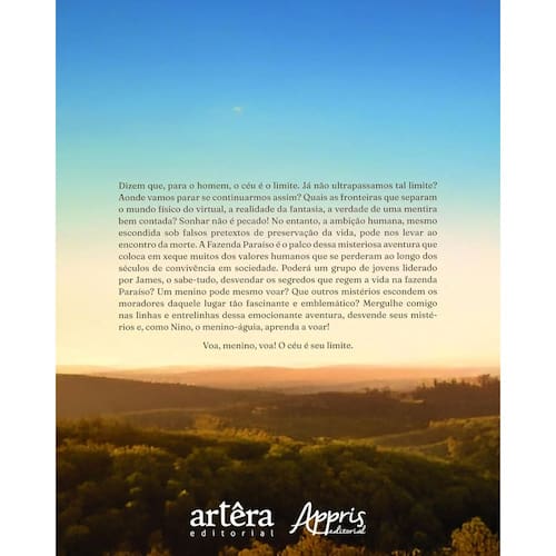 Dizem que, para o homem, o céu é o limite. Já não ultrapassamos tal limite? Aonde vamos parar se continuarmos assim? Quais as fronteiras que separam o mundo físico do virtual, a realidade da fantasia, a verdade de uma mentira bem contada? Sonhar não é pecado! No entanto, a ambição humana, mesmo escondida sob falsos pretextos de preservação da vida, pode nos levar ao encontro da morte. A Fazenda Paraíso é o palco dessa misteriosa aventura que coloca em xeque muitos dos valores humanos que se perderam ao longo dos séculos de convivência em sociedade. Poderá um grupo de jovens liderado por James, o sabe-tudo, desvendar os segredos que regem a vida na fazenda Paraíso? Um menino pode mesmo voar? Que outros mistérios escondem os moradores daquele lugar tão fascinante e emblemático? Mergulhe comigo nas linhas e entrelinhas dessa emocionante aventura, desvende seus mistérios e, como Nino, o menino-águia, aprenda a voar! Voa, menino, voa! O céu é seu limite. Marca: Não Informado
