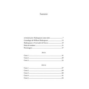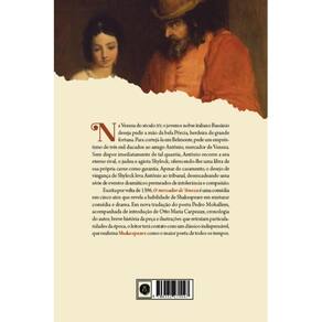 Na Veneza do século XV, o jovem e nobre italiano Bassânio deseja pedir a mão da bela Pórcia, herdeira de grande fortuna. Para cortejá-la em Belmonte, pede um empréstimo de três mil ducados ao amigo Antônio, mercador de Veneza. Sem dispor imediatamente de tal quantia, Antônio recorre a seu eterno rival, o judeu e agiota Shylock, oferecendo-lhe uma libra de sua própria carne como garantia. Apesar do casamento, o desejo de vingança de Shylock leva Antônio ao tribunal, desencadeando uma série de eventos dramáticos permeados de intolerância e compaixão. Escrita por volta de 1596, O mercador de Veneza é uma comédia em cinco atos que revela a habilidade de Shakespeare em misturar comédia e drama. Em nova tradução do poeta Pedro Mohallem, acompanhada de introdução de Otto Maria Carpeaux, cronologia do autor, breve história da peça e ilustrações que retratam particularidades da época, o leitor terá contato com um clássico indispensável, que reafirma Shakespeare como o maior poeta de todos os tempos. Esta edição conta com a introdução de Otto Maria Carpeaux