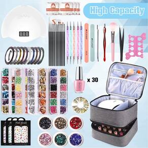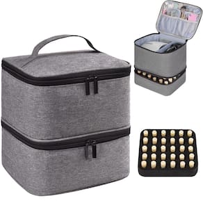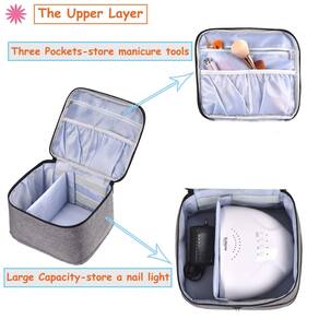 A bolsa de esmalte é projetada para armazenar esmaltes e acessórios - Material: O estojo organizador de esmalte é feito de nylon resistente, durável e resistente a arranhões - Tamanho: 24 x 20 x 25 cm. A bolsa de esmalte é grande o suficiente para guardar todos os seus esmaltes e acessórios de manicure de maneira organizada - A camada superior: a camada superior tem um grande compartimento e um divisor removível, que pode conter a lâmpada de unha e o cabo de alimentação. E há três bolsos para suas lixas, broca de unha, removedor de esmalte, almofadas de algodão e etc - A camada inferior: o compartimento inferior com uma inserção de espuma removível pode conter 30 frascos de esmalte de 15 ml. Importante, a inserção de espuma macia pode ser adequada para mais garrafas de tamanhos variados e garante que cada frasco de esmalte seja colocado separadamente, evitando batidas - Ótimo para viagens: o organizador de armazenamento de esmalte tem uma alça resistente na parte superior. É conveniente para você levá-lo para qualquer lugar. Presente perfeito para seus amigos ou familiares