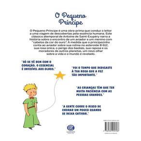 O Pequeno Príncipe é uma obra prima que conduz o leitor a uma viagem de descobertas pela essência humana. Este clássico atemporal de Antoine de Saint-Exupéry narra a história sobre o encontro de um aviador e um menino com “cabelos da cor do ouro”. À medida que o principezinho conta ao aviador sobre sua rotina no asteroide B 612, sua rosa única, o perigo dos baobás, sua raposa e os moradores de outros planetas, um novo olhar sobre a vida e o mundo é revelado.