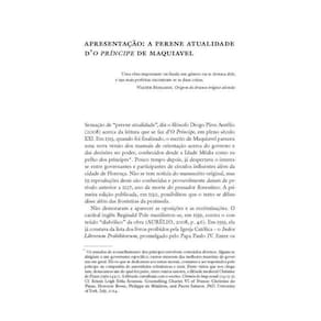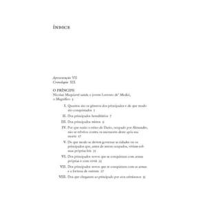A grandeza e originalidade de O Príncipe consiste em ter alargado o campo da ciência na política, distinguindo os interesses políticos primários das classes, mas confundindo-os, ao mesmo tempo, em uma monstruosa razão de Estado pela qual o povo é apenas matéria plástica nas mãos do Príncipe. 4ª edição totalmente revista, prefaciada pelo sociólogo francês Raymond Aron, com uma cronologia da vida e obra de Maquiavel e Vocabulário dos termos-chave de Maquiavel