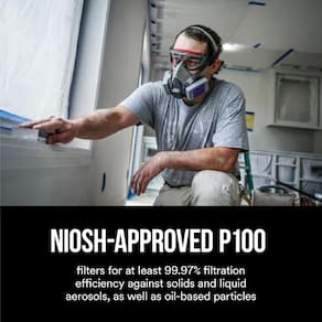 - Filtros P100 aprovados pela NIOSH para pelo menos 99,97% de eficiência de filtragem contra sólidos e aerossóis líquidos, bem como óleos