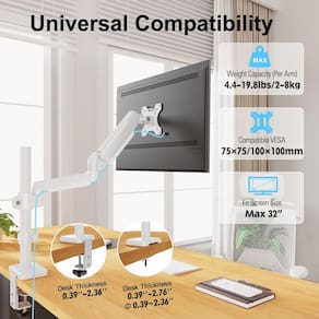 - Ampla compatibilidade - O suporte de mesa para monitor ErgoFocus é compatível com a maioria dos monitores de computador planos e curvos de até 32” com VESA 75x75mm ou 100x100mm. Suportando o peso de 4,4 a 19,8 libras, vem com as opções de suporte por braçadeira e base com ilhó -