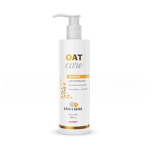 Shampoo Oat Care Para Cães e Gatos Avert - 200mL - Indicado para cães e gatos; - Pele hidratada; - Pelos mais brilhosos; - Ideal para peles sensíveis. O Shampoo para cães e gatos Oat Care Avert é ideal para os banhos do seu bichinho ficarem ainda mais completo. Com extrato de aveia, garante que a pele e os pelos do cãozinho ou do gatinho fiquem hidratados e com mais brilho. Além disso o produto é indicado para animaizinhos que tenham a pele sensível. Modo de usar Molhar a pelagem e aplicar o produto, massageando bem até formar uma espuma uniforme. Enxaguar bem. Animais de pelagem curta: 1 pump/kg Animais de pelagem longa: 2 pumps/kg