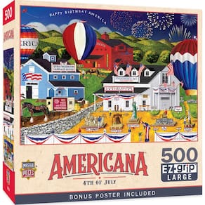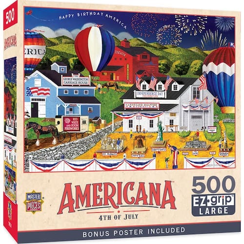 Masterpieces - Quebra-cabeça de 500 peças, formas grandes de aderência EZ, 4 de julho, divertido para adultos, idosos, família, crianças, 49 x 68 cm - PEÇAS EXTRA GRANDES: Nossos quebra-cabeças EZ Grip apresentam peças grandes e mais grossas para facilitar a coleta e manipulação; cuidadosamente trabalhados com crianças pequenas e idosos em mente - FORMAS ÚNICAS: O quebra-cabeça possui 500 peças em uma variedade de cortes, garantindo um desafio; peças grossas entrelaçadas seguram firmemente; acabamento fosco reduz a tensão visual; um pôster vibrante e colorido está incluído para referência enquanto você o monta - Responsável pelo meio ambiente: Masterpieces é uma empresa americana de quebra-cabeças e jogos; nossos quebra-cabeças são feitos de material 100% reciclado e tintas à base de soja não tóxicas - Desafio: Nossos quebra-cabeças são projetados para serem divertidos e mentalmente estimulantes; ajudam no relaxamento; aumentam as habilidades de resolução de problemas; ótima atividade social com a família e amigos - Entretenimento para todos: a coleção MasterPieces oferece a maneira perfeita de manter a diversão noturna do jogo; selecione entre quebra-cabeças para adultos, idosos e crianças; baralhos exclusivos de baralho, jogos de tabuleiro, dominó, kits de artesanato e muito mais