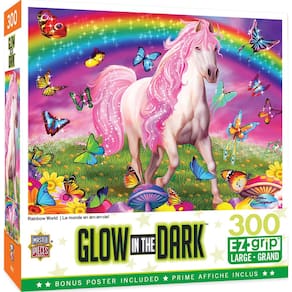 MasterPieces - Quebra-cabeça de 300 peças com formas grandes de aderência EZ, brilha no escuro, mundo do arco-íris, diversão para adultos, idosos, família, crianças, 45,7 cm x 61 cm - Brilha no escuro: Depois de terminar o quebra-cabeça, apague as luzes e fique hipnotizado com os excelentes efeitos de brilho; é um presente encantador para você ou um entusiasta de quebra-cabeças; Masterpieces é uma empresa americana de quebra-cabeças e jogos - PEÇAS EXTRA GRANDES: Nossos quebra-cabeças EZ Grip apresentam peças grandes e mais grossas para facilitar a coleta e manipulação; cuidadosamente trabalhados com crianças pequenas e idosos em mente; projetados para serem divertidos e mentalmente estimulantes; ajudam no relaxamento; aumentam as habilidades de resolução de problemas; ótima atividade social com a família e amigos - Formas exclusivas: o quebra-cabeça possui 300 peças em uma variedade de cortes, garantindo um desafio; peças entrelaçadas se encaixam para um ajuste seguro; acabamento fosco antirreflexo reduz o cansaço visual; um pôster vibrante e colorido está incluído para referência enquanto você o monta - Responsável pelo meio ambiente: este quebra-cabeça é feito de material 100% reciclado e tintas à base de soja não tóxicas - Entretenimento para todos: a coleção MasterPieces oferece a maneira perfeita de manter a diversão noturna do jogo; selecione entre quebra-cabeças para adultos, idosos e crianças; baralhos exclusivos de baralho, jogos de tabuleiro, dominó, kits de artesanato e muito mais