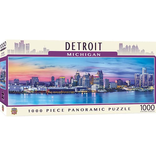 - DETROIT, MICHIGAN: Este quebra-cabeça panorâmico mostra a paisagem urbana de tirar o fôlego da icônica cidade de Michigan; as margens pitorescas do rio Detroit, marcos encantadores e horizonte imponente; Masterpieces é uma empresa americana de quebra-cabeças e jogos