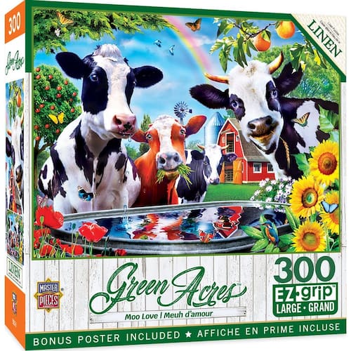 MasterPieces - Quebra-cabeça de 300 peças, formas grandes EZ Grip, Moo Love, divertido para adultos, idosos, família, crianças, acabamento fosco, 45,7 cm x 61 cm - PEÇAS EXTRA GRANDES: Nossos quebra-cabeças EZ Grip apresentam peças grandes e mais grossas para facilitar a coleta e manipulação; cuidadosamente trabalhados com crianças pequenas e idosos em mente; finalmente, quebra-cabeças que toda a família pode desfrutar juntos - FORMAS ÚNICAS: O quebra-cabeça possui 300 peças em uma variedade de cortes, garantindo um desafio; peças grossas entrelaçadas seguram firmemente; um pôster vibrante e colorido está incluído para referência enquanto você o monta - Responsável pelo meio ambiente: este quebra-cabeça é feito de material 100% reciclado e tintas à base de soja não tóxicas; Masterpieces é uma empresa americana de quebra-cabeças e jogos - Desafio: Nossos quebra-cabeças são projetados para serem divertidos e mentalmente estimulantes; ajudam no relaxamento; aumentam as habilidades de resolução de problemas; ótima atividade social com a família e amigos - Entretenimento para todos: a coleção MasterPieces oferece a maneira perfeita de manter a diversão noturna do jogo; selecione entre quebra-cabeças para adultos, idosos e crianças; baralhos exclusivos de baralho, jogos de tabuleiro, dominó, kits de artesanato e muito mais