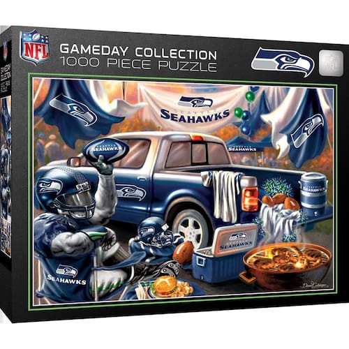 MasterPieces - Quebra-cabeça de 1000 peças, NFL Seattle Seahawks, divertido para adultos e família, acabamento sem brilho, 49 cm x 68 cm - Licenciado oficialmente: nossos quebra-cabeças NFL são oficialmente licenciados pelas ligas em que seus times favoritos jogam; divertidos para dias de jogos e não autorização; o nível de dificuldade é apropriado para um fã adulto desfrutar; para crianças menores de 14 anos, esses quebra-cabeças são melhor feitos em família - FORMAS ÚNICAS: O quebra-cabeça possui 1.000 peças em uma variedade de cortes, garantindo um desafio; peças grossas interligadas seguram firmemente; acabamento fosco antirreflexo reduz o cansaço visual - Responsável pelo meio ambiente: nossos quebra-cabeças são feitos de material 100% reciclado e tintas à base de soja não tóxicas - Entretenimento para todos: a coleção MasterPieces oferece a maneira perfeita de manter a diversão noturna do jogo; selecione entre quebra-cabeças para adultos, idosos e crianças; baralhos exclusivos de baralho, jogos de tabuleiro, dominó, kits de artesanato e muito mais