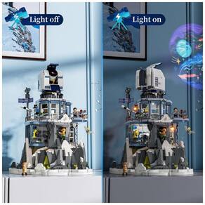 Conjunto de blocos de montar com 2437 peças que representa um observatório alpino construído sobre base rochosa com neve, inspirado em observatórios de cúpula instalados em montanhas. A estrutura possui quatro níveis principais, com áreas técnicas, laboratórios envidraçados e cúpula superior com telescópio.?