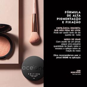 Océane Glossy Rose Gold - Blush 7,2g - O Glossy Blush dá cor as maçãs do rosto de forma suave e elegante, é compacto e possui partículas de brillho que dão em acabamento citilante, deixando a sua maquiagem ainda mais bonita. - Um dos blushes mais amados da Océane agora faz parte da linha Edition! O Glossy Blush Océane Edition é o blush em pó compacto que não pode faltar no seu nécessaire.Puxando para um tom rosa corado mais quente, o Glossy Blush possui o tom Rose Gold que contém partículas de brilho que dão um acabamento cintilante e deixam sua make linda.Precisa de um item para dar um up às suas maçãs do rosto? Este Blush traz aquele ar de saúde e luminosidade incríveis para o seu look.Sua textura é em pó compacto, fácil de aplicar e com muita pigmentação. Já a embalagem vem com um espelho, para retocar a make sempre que precisar. O que procurar em um blush? - Um tom que combina com diversas situações: seja para trabalhar, para momentos de lazer ou para construir um look para festas. O Glossy Blush é perfeito para você se sentir bem e dar ao seu rosto um ar de corado. Confira mais benefícios: Longa duração e pigmentação - Com fórmula super pigmentada e durável, o Glossy Blush vai ser seu companheiro inseparável. Sua textura em pó compacto é fácil de esfumar, facilita a construção de camadas e não deixa o rosto marcado. Você decide como usar de acordo com o seu estilo! Tonalidade versátil A tonalidade Rose Gold combina super bem em diversas situações, desde as mais formais até aquele encontro romântico. Essa cor sofisticada combina com diversos tons de pele, deixando um aspecto natural e glamuroso. Efeito Natural Dá um leve toque de brilho e luminosidade no rosto, além disso, se adapta a qualquer tipo de maquiagem, podendo ser mais ou menos pigmentado, a depender da aplicação. apVocê podelicar com um Pincel de cerdas macias, para garantir um esfumado incrível que vai se misturar com a sua pele.